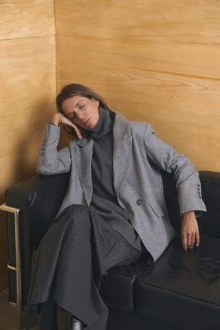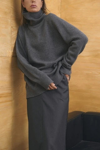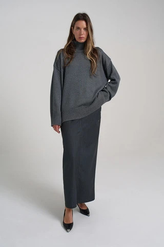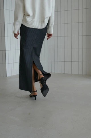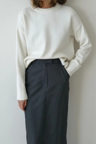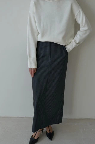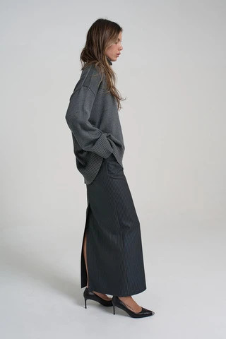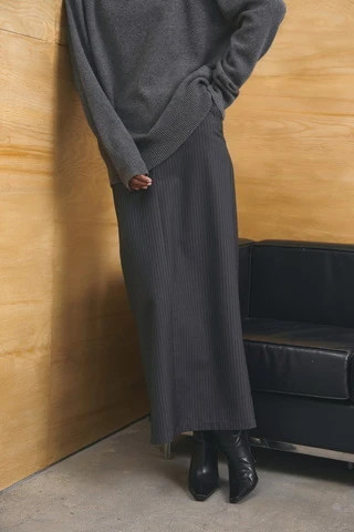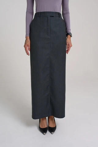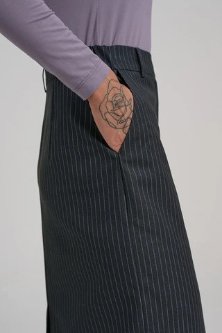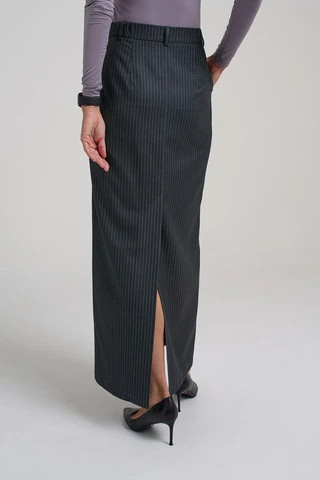 Прямая юбка длины макси в контрастную полоску. Пояс с эластичными вставками по бокам и шлевками для ремня, застежка на молнию и потайной крючок. Длинная шлица сзади придает легкости и не сковывает движения. Носите юбку в паре с жакетом из нашей коллекции или комбинируйте вместе с другими изделиями в вашем гардеробе.