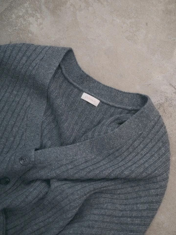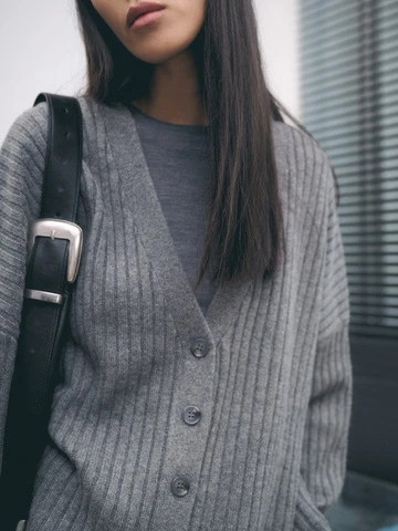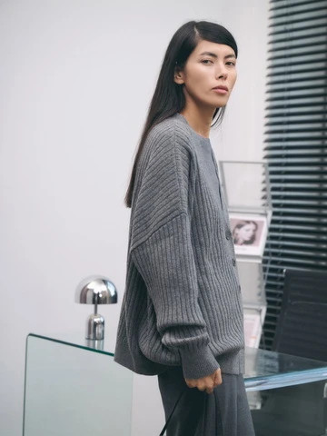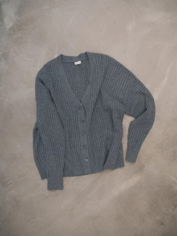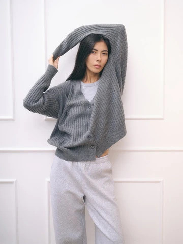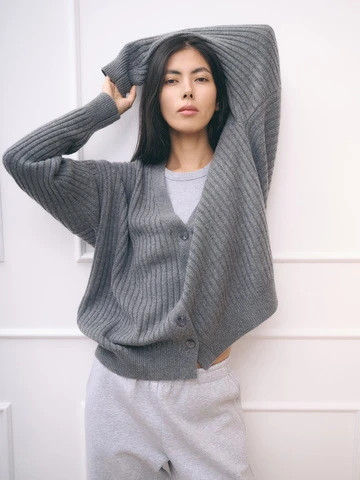 Объемный кардиган в рубчик средней длины. Модель выполнена из смеси шерсти мериноса и кашемира, что обеспечивает тепло, мягкость и долговечность изделия. Спущенная линия плеча, V-образный вырез и прямые резинки по нижнему краю изделия и манжетам.